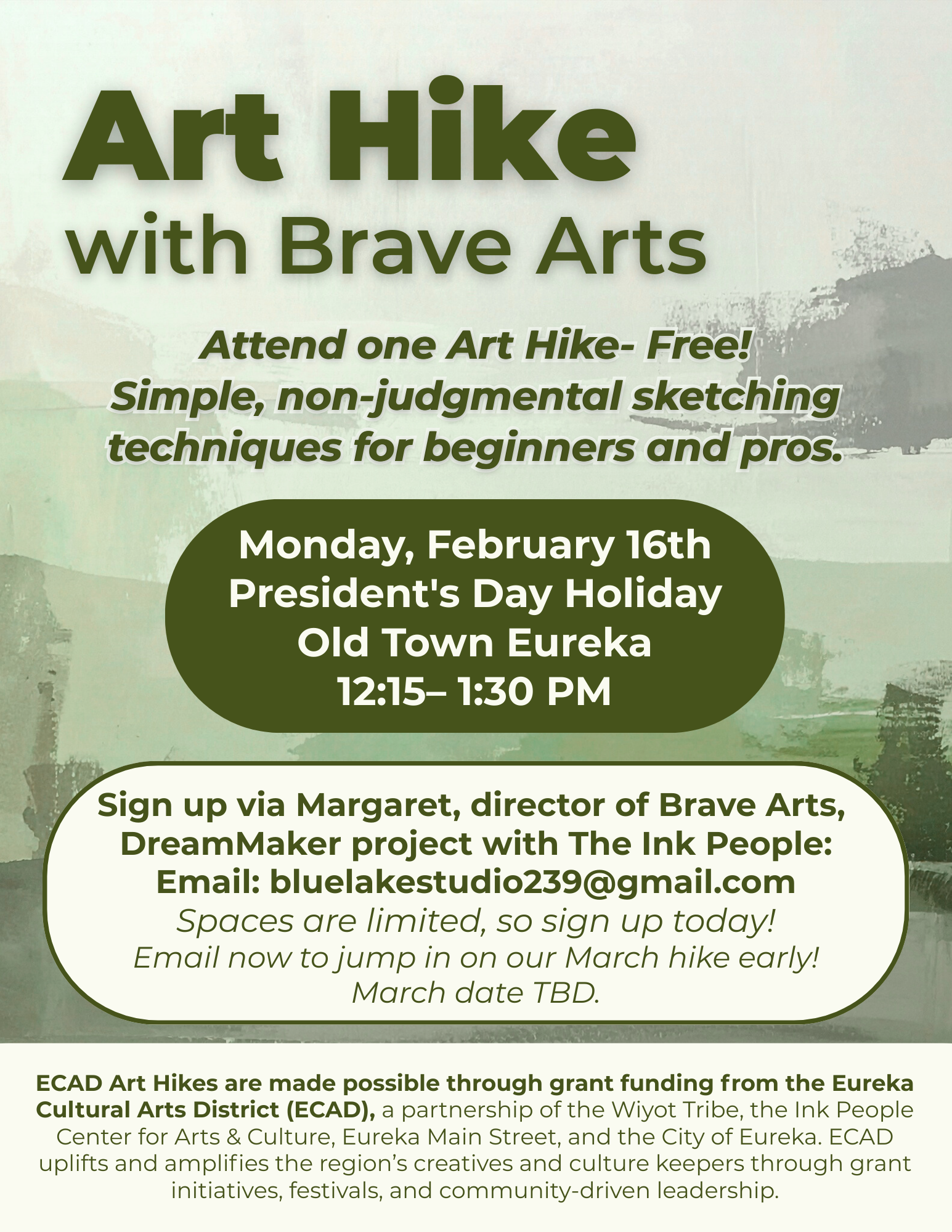 ECAD Art Hikes are made possible through grant funding from the Eureka Cultural Arts District (ECAD), a partnership of the Wiyot Tribe, the Ink People Center for Arts & Culture, Eureka Main Street, and the City of Eureka. ECAD uplifts and amplifies the region’s creatives and culture keepers through grant initiatives, festivals, and community-driven leadership.